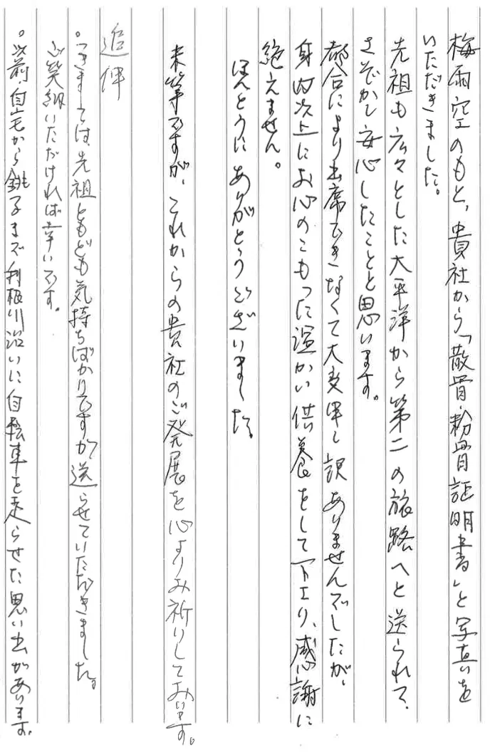 都合により出席できなくて大変申し訳ありませんでしたが、身内以上にお心のこもった温かい供養をして下さり、感謝に絶えません。